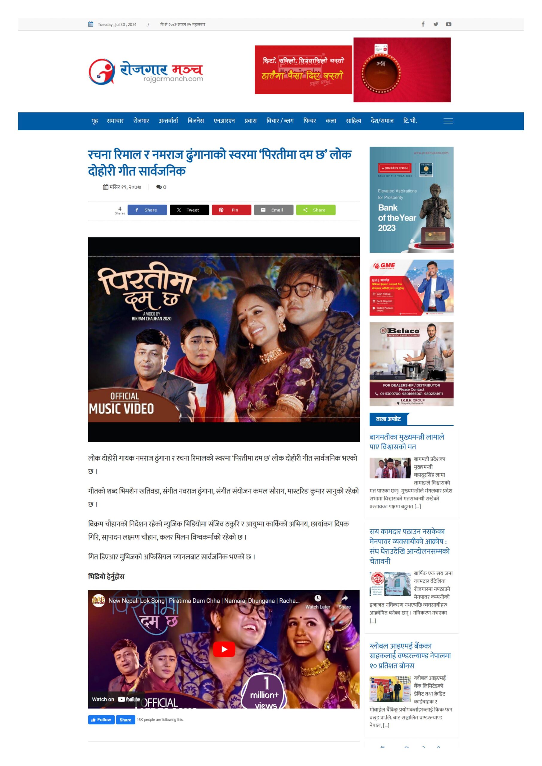 रचना रिमाल र नमराज ढुंगानाको स्वरमा ‘पिरतीमा दम छ’ लोक दोहोरी सार्वजनिक शिर्षकको समाचार रोजगार मञ्चमा प्रकाशित समाचार हो ।
